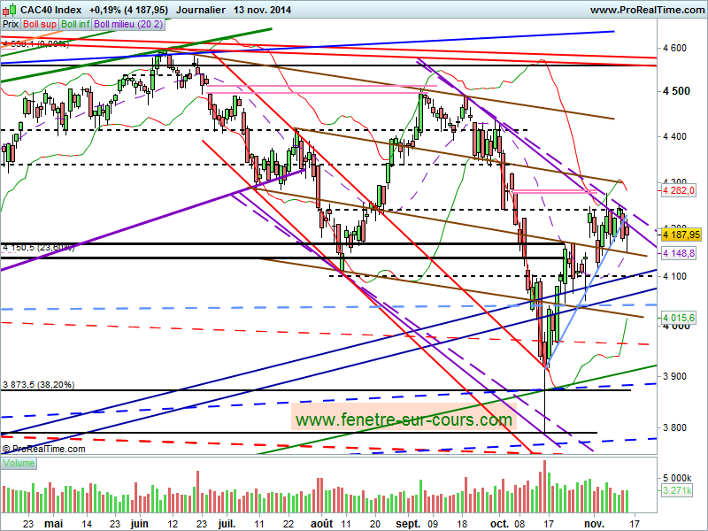 La bourse de Paris reste donc faible, mais la réaction haussière au contact de la zone des 4150 (MM20 + oblique marron), et le reflux qui a suivi, sommes toutes modéré au regard de celui de Wall Street, sont loin d’être inintéressants, alors même d’ailleurs que le pétrole repartait de plus belle à la baisse.