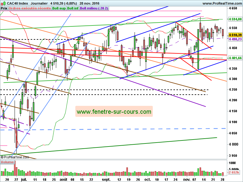Wall Street a fait un peu plier le CAC et les marchés européens en ce début de semaine, renvoyant la bourse de Paris sur les 4500 pts. Mais le CAC 40 reste malgré tout toujours dans son étroit range post-Trump, et il n’y a donc pas vraiment de nouveau par rapport à mes analyses de la semaine dernière.