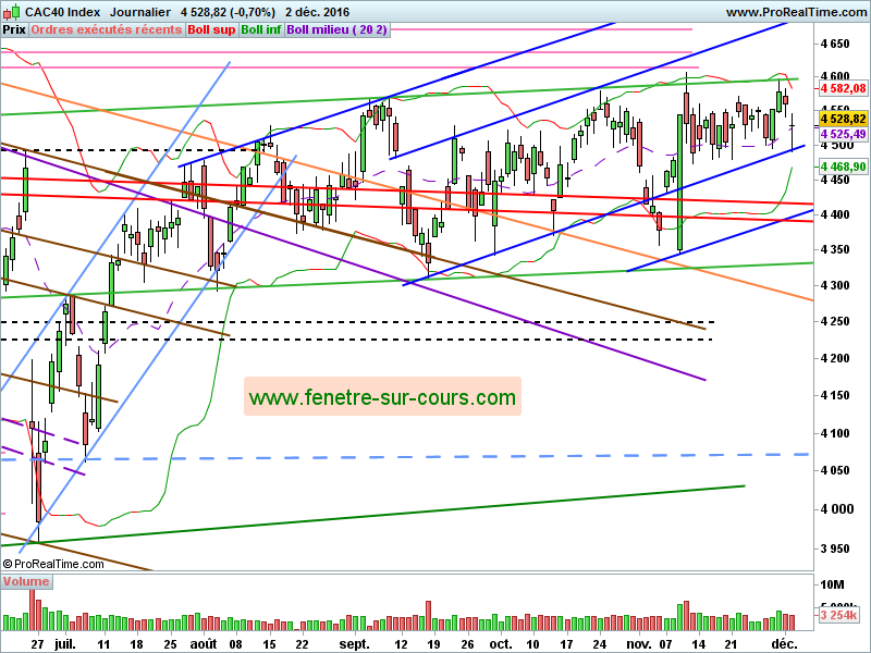 Mais avec la bougie du jour et l’appui sur le bas du range post-Trump, il n’est pas exclu que nous assistions à un redémarrage haussier, et même un franchissement de la résistance verte des 4595/4600 pts, une fois l’incertitude levée sur le référendum italien. Alors le CAC devrait rapidement aller chercher le gap de début d’année entre 4607 et 4637, puis pourquoi pas le gap du 31/12, entre 4667 et 4672.