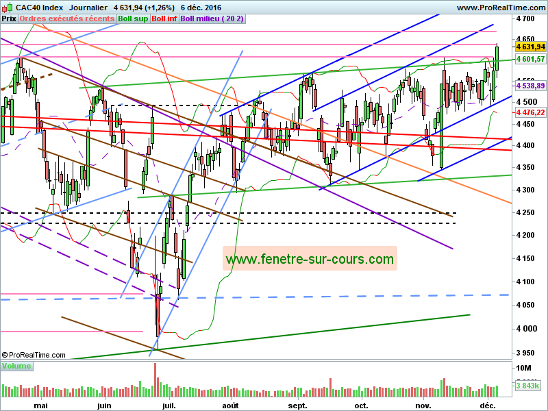 Pour demain, il sera très intéressant de surveiller si le marché nous offre la confirmation au franchissement du jour. Il faudra pour cela préserver absolument la zone de support des 4600/4605, et idéalement aller non seulement invalider le gap baissier du 04/01, mais également aller chercher le gap baissier du 31/12 entre 4667 et 4672. Enfin, au dessus, nous aurons l’oblique bleue des 4695 qui pourrait bloquer la progression et provoquer une petite consolidation.