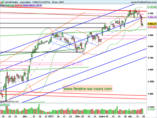 A la hausse, ce n’est qu’au dessus des 5050, avant confirmation au dessus des 5060/5065, que le CAC retrouverait une configuration plus favorable. Un retour sur ces niveaux avant le week-end semble toutefois improbable dans le contexte actuel (élections + géopolitique avec les tensions avec la Corée du Nord).