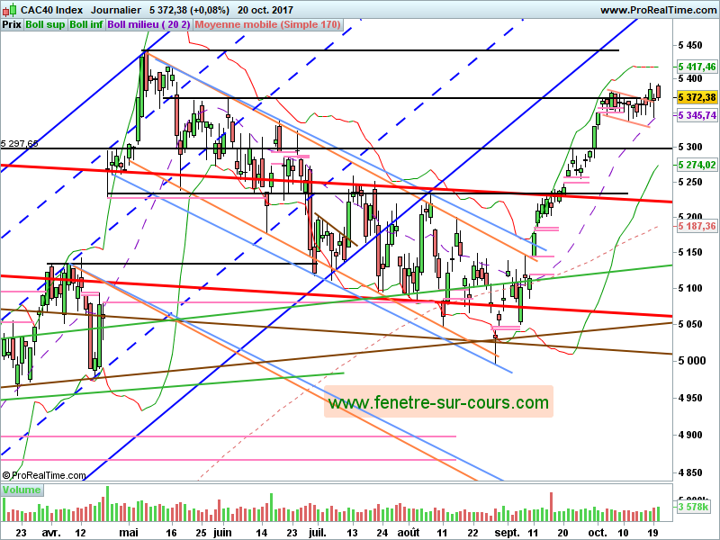A la baisse, la zone des 5340/5345, renforcée par la MM20, semble vouloir prendre le pas sur le support orange : en cas de cassure des 5340, le retournement pourrait être assez net, avec un premier objectif sur les 5300 pts, avant probablement au moins le dernier des 3 gaps ouverts début septembre.